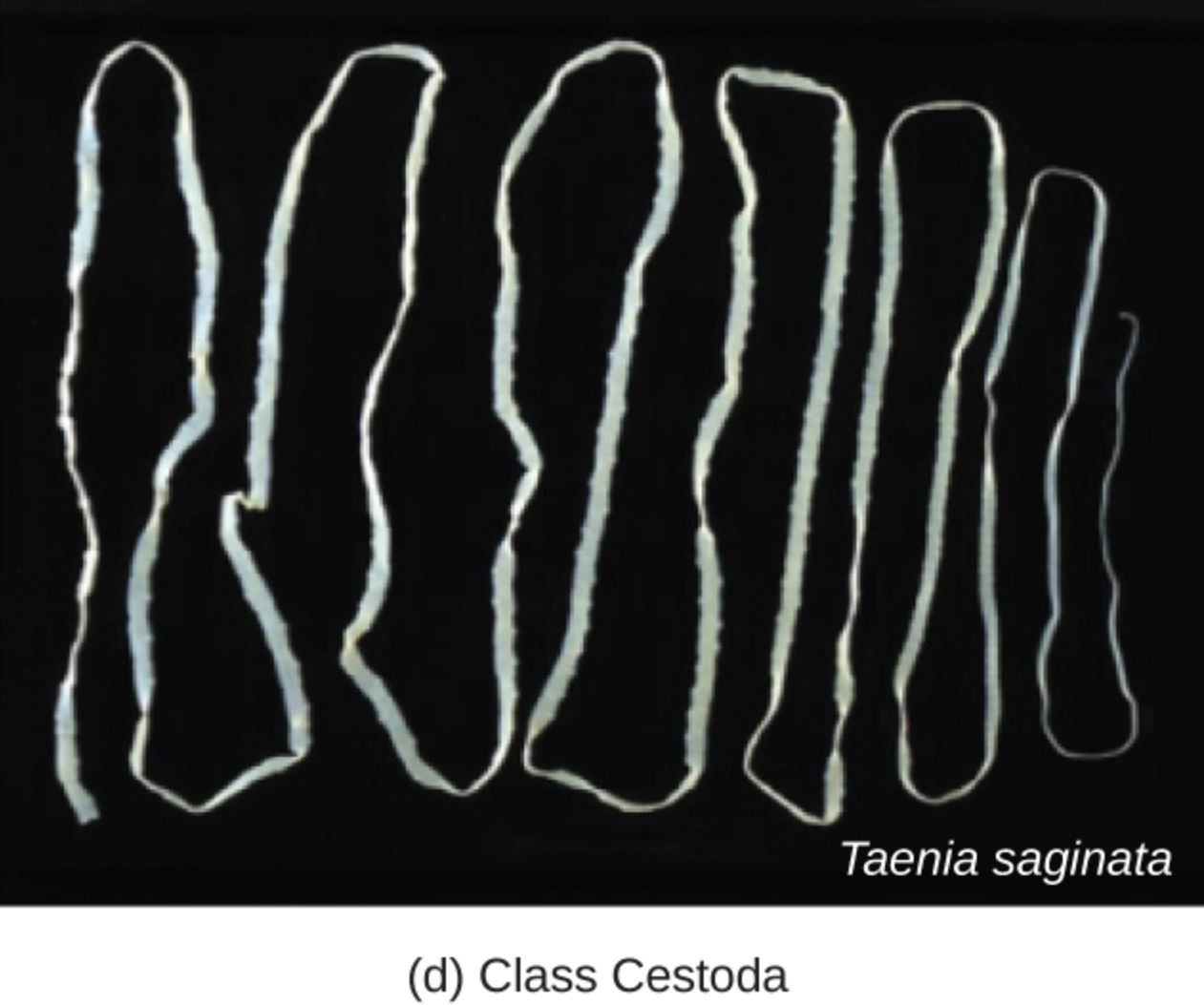 Taenia saginata: This label identifies the adult beef tapeworm, which is a giant among intestinal parasites, often growing to several meters in length. It is composed of a head, a neck, and a long chain of reproductive segments that allow it to produce thousands of eggs daily.
