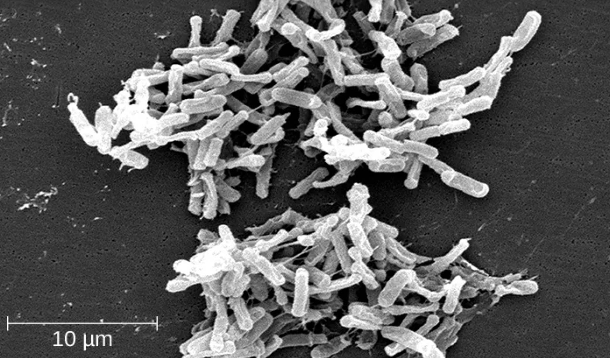 10 μm: This scale bar represents ten micrometers in length, providing a crucial visual reference for the microscopic size of the bacterial colony. It demonstrates that individual rod-shaped bacilli are extremely small, usually ranging from 3 to 6 micrometers in length, which allows them to colonize the intricate folds of the human intestinal lining.