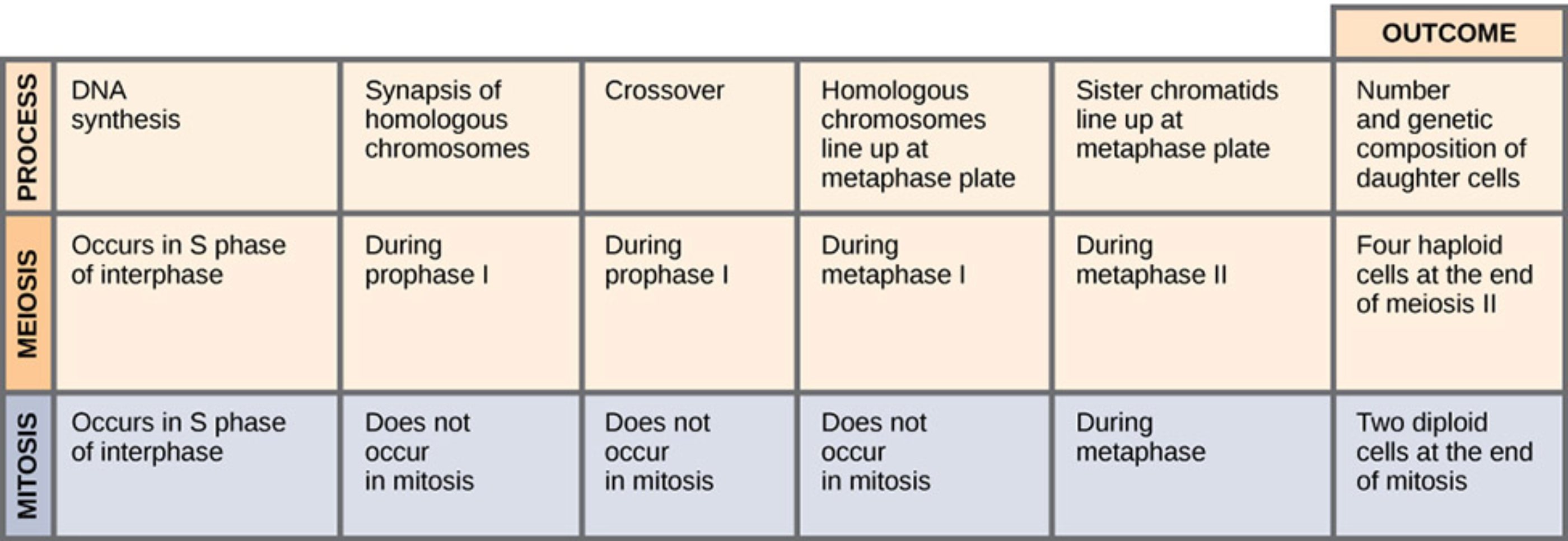 Process: This header refers to the various biochemical and mechanical stages that occur during cellular replication. It categorizes the specific events that distinguish the different paths of division, such as genetic recombination and chromosomal alignment.