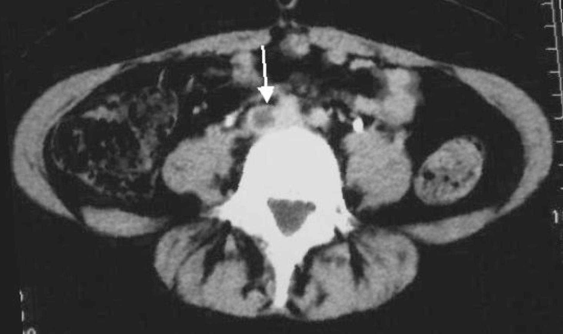 The abdominal CT scan is invaluable for assessment because it shows the “filling defect.” When contrast dye is injected into the bloodstream, it turns the liquid blood bright white on the scan. A clot, being a solid mass, does not absorb the dye and remains dark grey. In the provided image, the vertebral body (spine) is the bright white structure in the center, and the thrombosed vein is adjacent to it. Identifying this defect confirms the diagnosis and helps physicians measure the extent of the clot—specifically, whether it extends into the inferior vena cava.