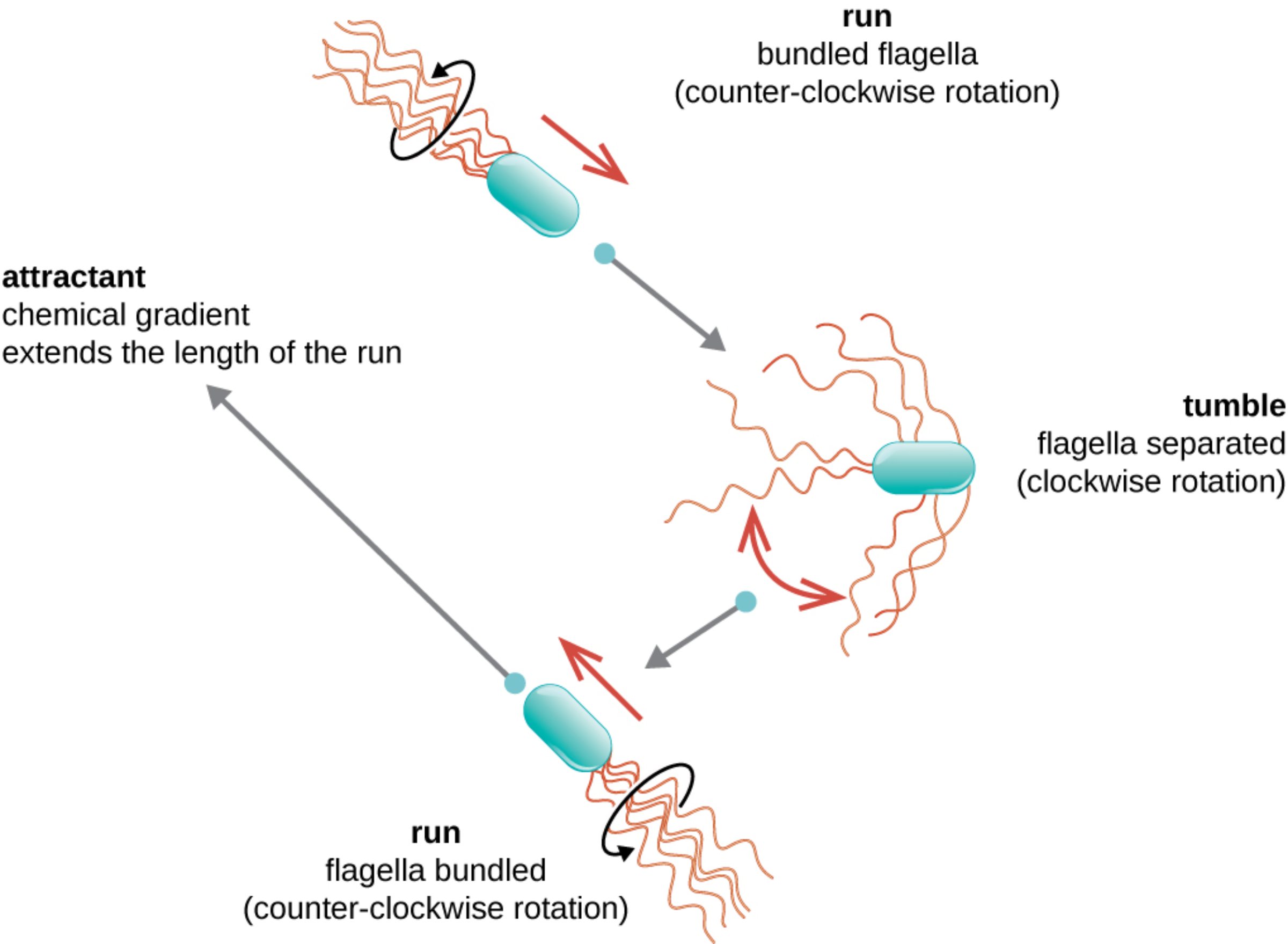 run flagella bundled (counter-clockwise rotation): After a tumble, the cell resumes a counter-clockwise rotation to re-bundle the appendages and start a new run. Because the tumble reorients the cell randomly, this new run will likely head in a different direction than the previous one.