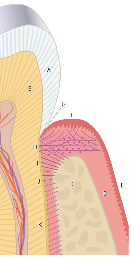 The periodontal apparatus represents a complex biological system that provides crucial support, nutrition, and sensory functions to the teeth. This detailed anatomical illustration depicts the key structures that comprise the periodontium, including the gingival tissue, periodontal ligament fibers, cementum, and alveolar bone. Together, these specialized tissues form a functional unit that anchors teeth within the jaw while allowing for minute movements during mastication and absorbing occlusal forces. The tooth is attached to the surrounding gingival tissue and alveolar bone (C) by fibrous attachments. The gingival fibers (H) run from the cementum (B) into the gingiva immediately apical to the junctional epithelial attachment, while the periodontal ligament fibers (I), (J), and (K) run from the cementum into the adjacent cortex of the alveolar bone. Understanding the normal anatomy and histology of these tissues is essential for dental professionals to accurately diagnose and treat periodontal conditions, perform surgical procedures, and implement effective preventive strategies to maintain periodontal health.