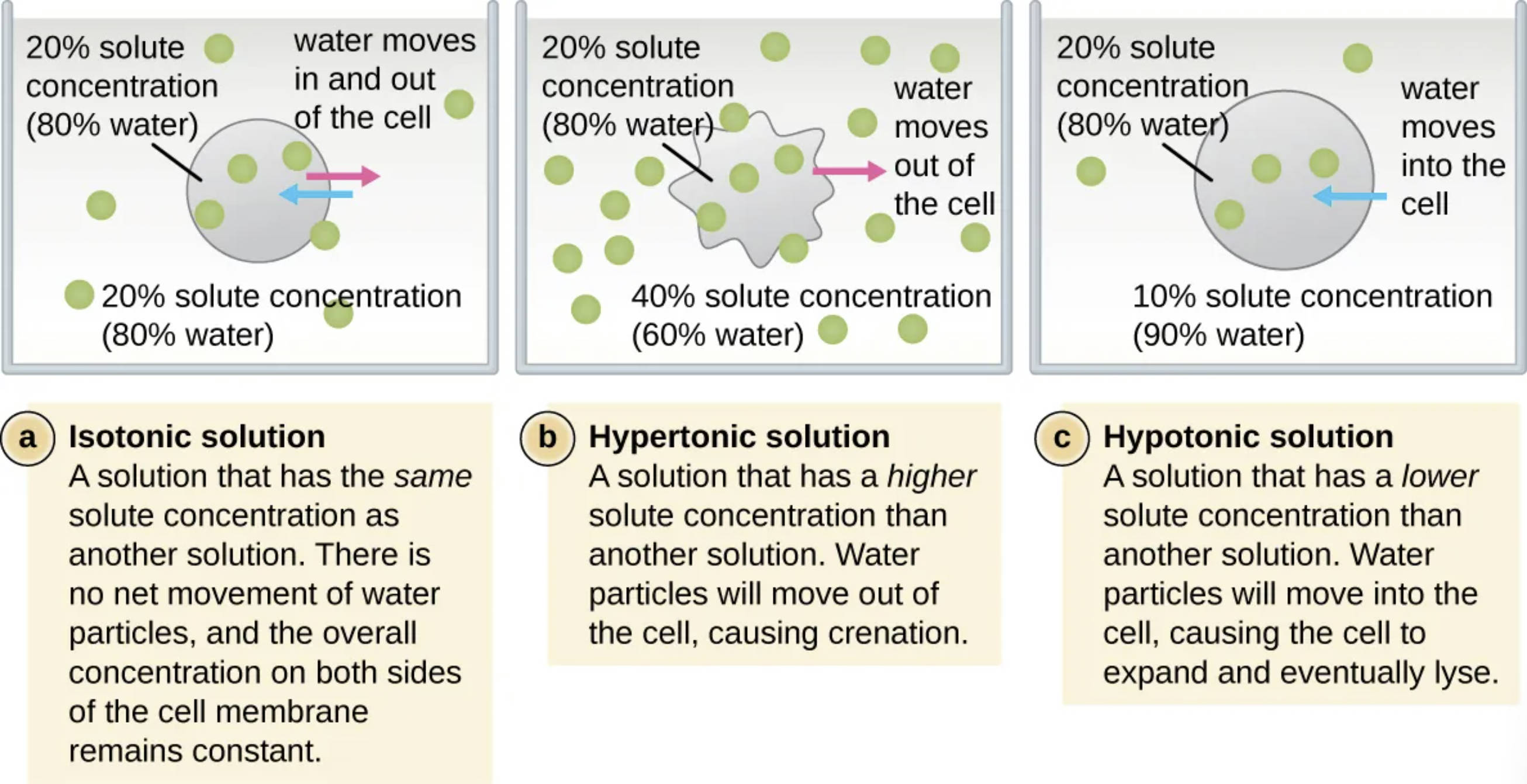 Hypertonic solution: This refers to an environment where the concentration of solutes outside the cell is higher than the concentration inside. As a result, water moves out of the cell via osmosis, causing the cell to shrink and undergo a process known as crenation.